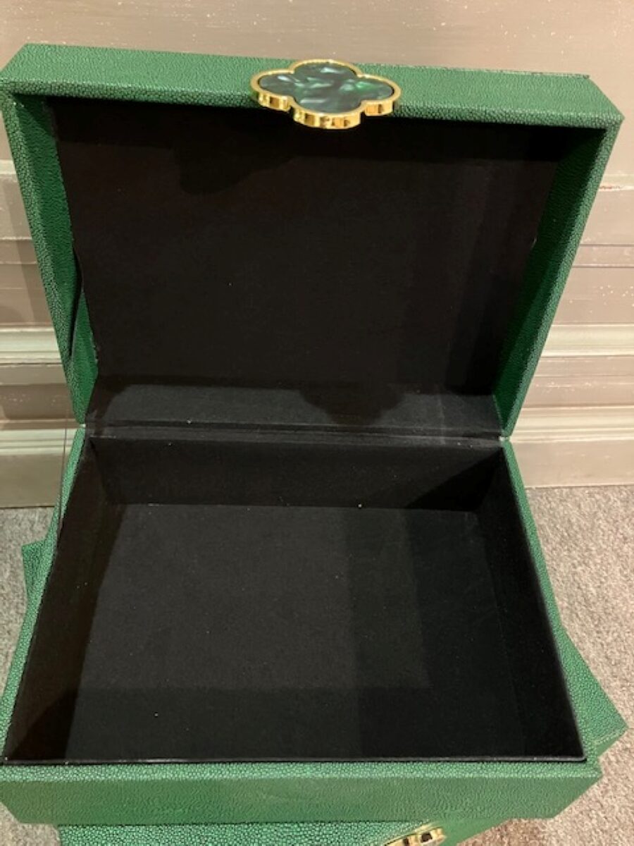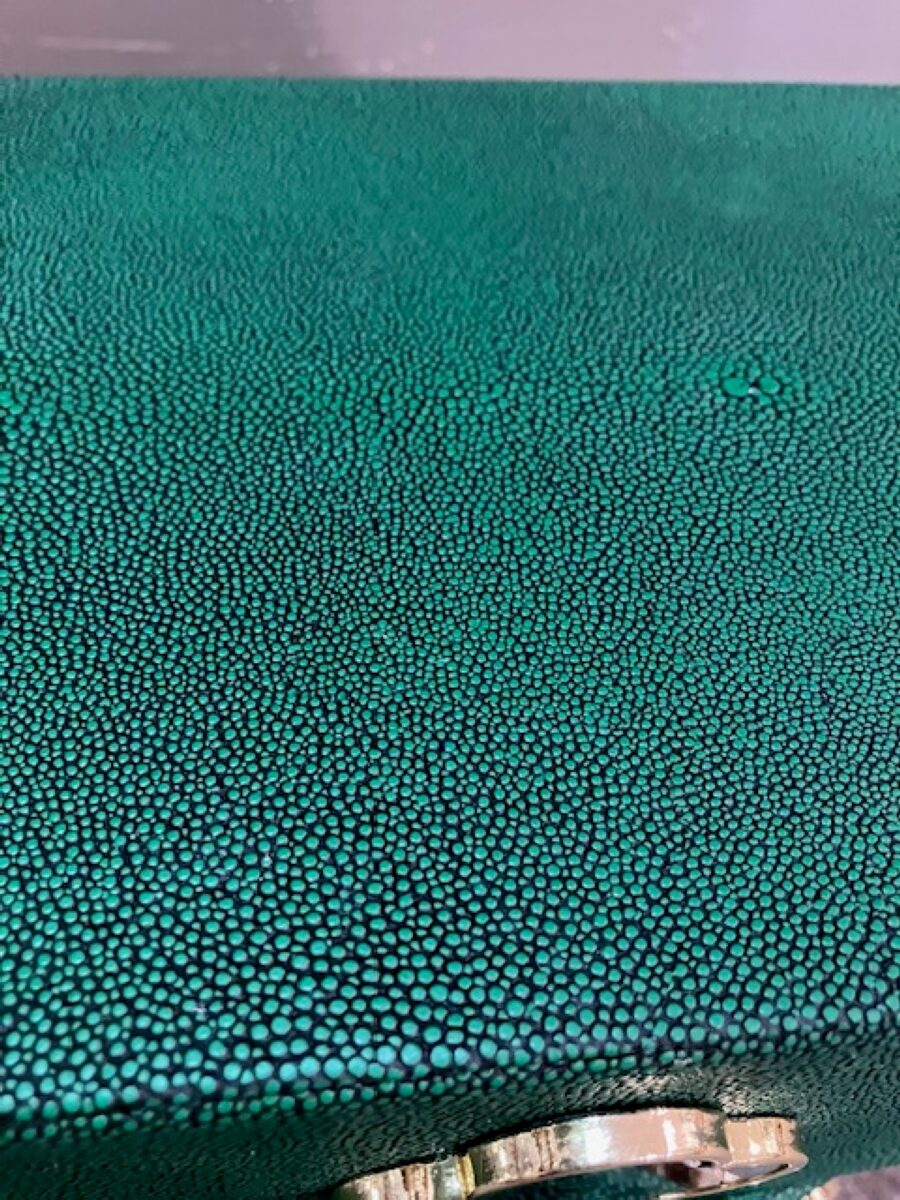 Whether you're curating a collection of fine jewellery or seeking an elegant way to keep your accessories organized, this Green Shagreen Box combines functionality with luxurious style, making it a must-have accessory for jewellery enthusiasts and interior decor lovers alike.