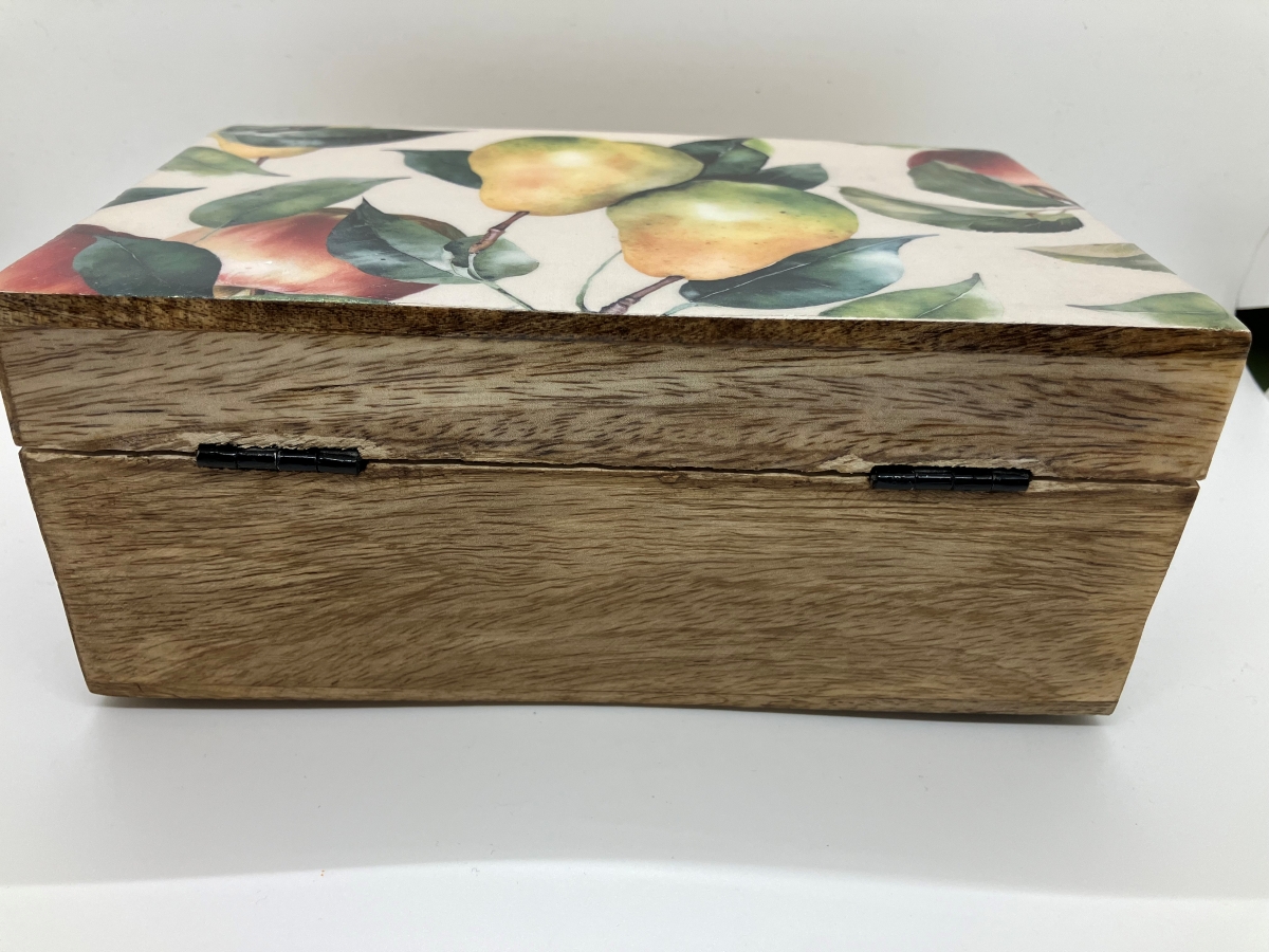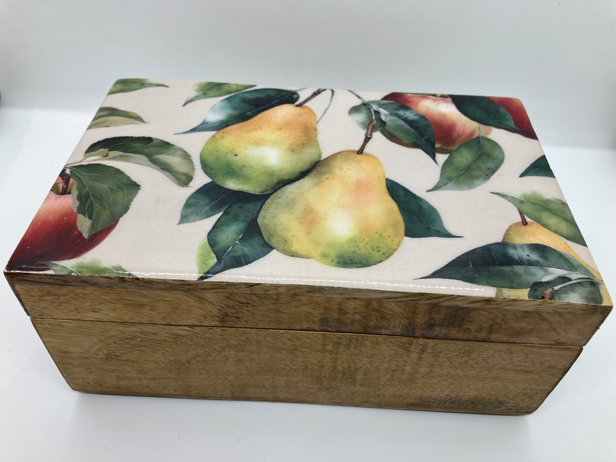 Add rustic elegance to your home with this Storage Box with pear design on lid. Crafted from Mango wood, this beautifully finished box features a glossy laminated pear design on the lid, bringing a touch of nature and fresh style to any room. The rich wood grain and natural colours make it a versatile addition to a variety of decor themes, from farmhouse to modern.